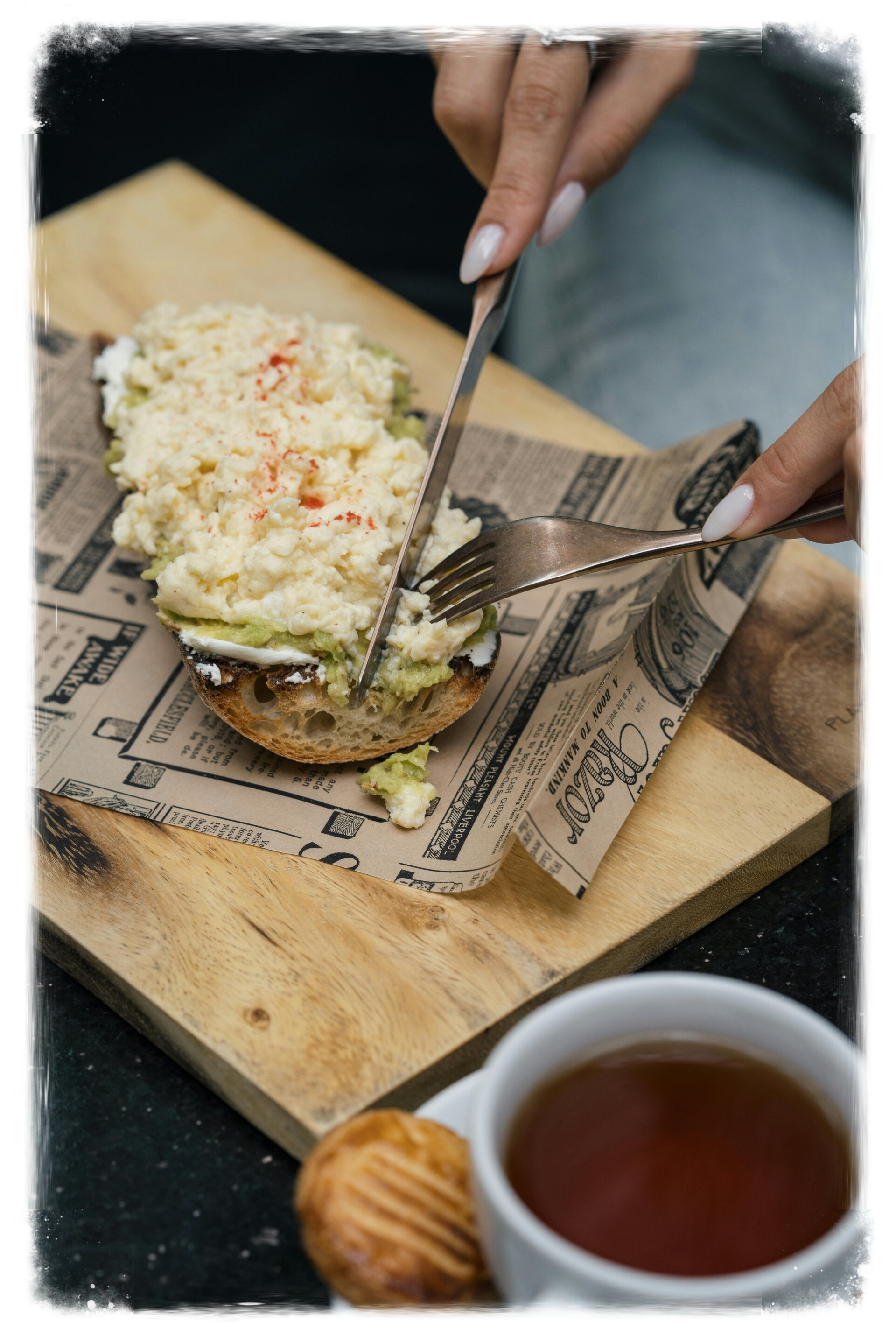 Brioche Brot, Rührei. Kräuterfrisch, Käse, Rucola, Srirachasauce